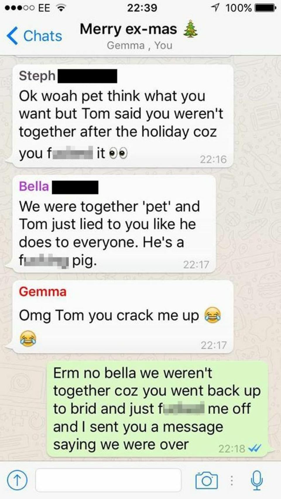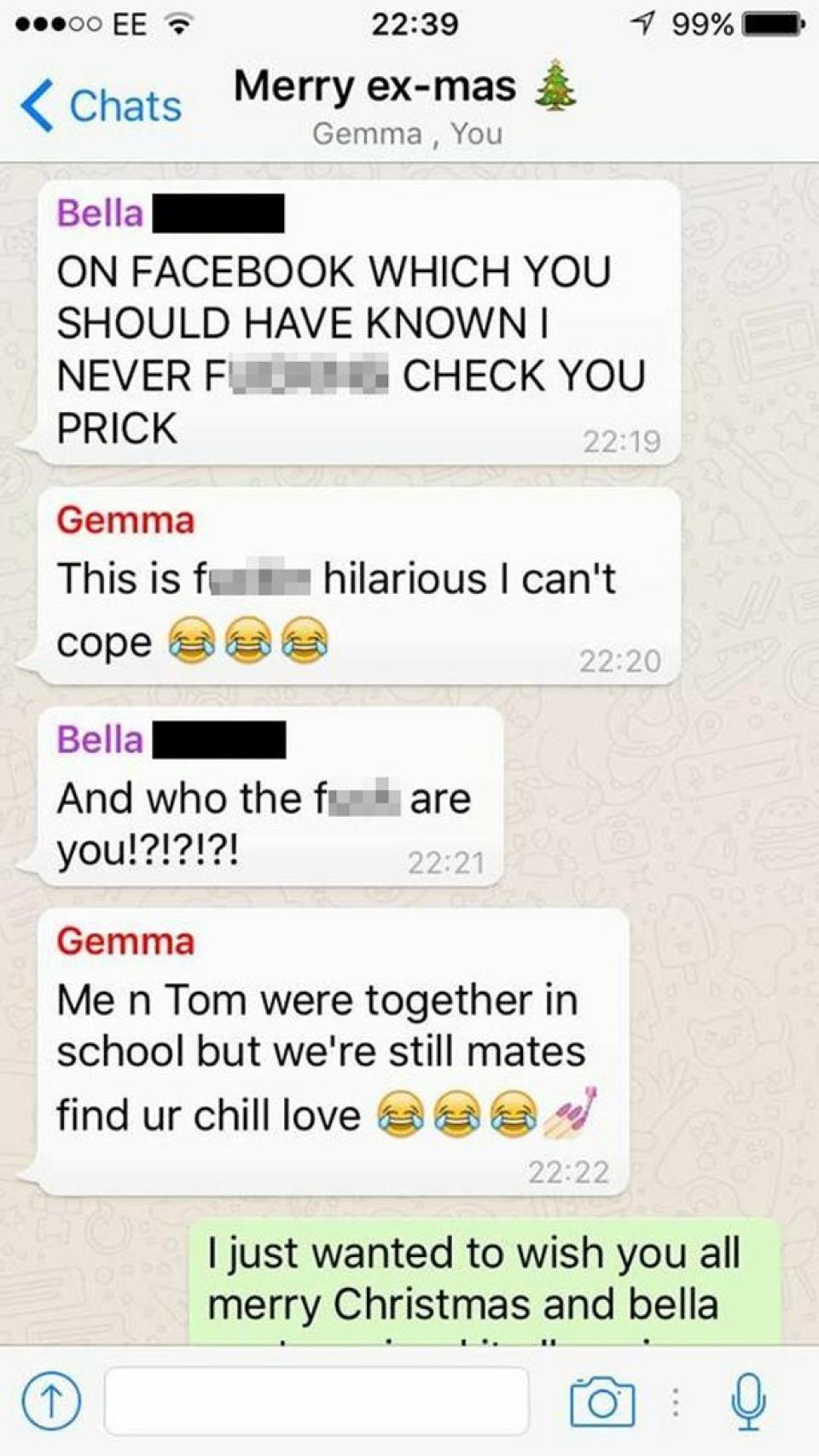 "¡Me escribiste a Facebook, que sabes que nunca o miro, imbécil!" le contestó en unas enfadadísimas mayúsculas. Gemma, mientras tanto, seguía partiéndose, algo que acabó por molestar a Bella, que acabó por preguntar "quién coño" era. "Yo y Tom estuvimos juntos en el colegio, pero seguimos siendo amigos", contestó.