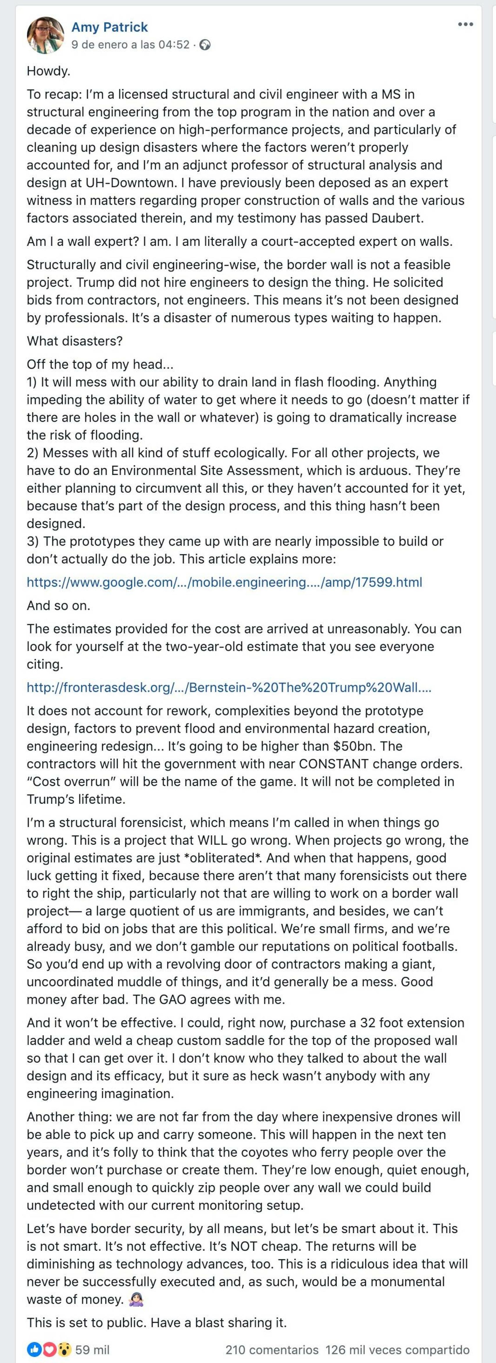 Si quieres leer su comentario completo solo tienes que ir a la página de Facebook de Amy Patrick. En él empieza presentándose: su currículum la califica para hablar sobre muros porque, aparte de ser ingeniera civil, está avalada en la planificación y construcción de muros. Trump haría bien en fichar a Amy, quizá hasta se le quitaría la idea de la cabeza.