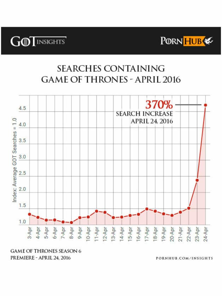 No son pocos quienes consideran que Juego de tronos tiene un poco de porno, y es que se anda con pocos remilgos a la hora de mostrar escenas de sexo. De hecho, no se hace raro que alguien quiera buscar algún momento concreto para sus cosas del amor propio. Pornhub nos lo confirmó:
