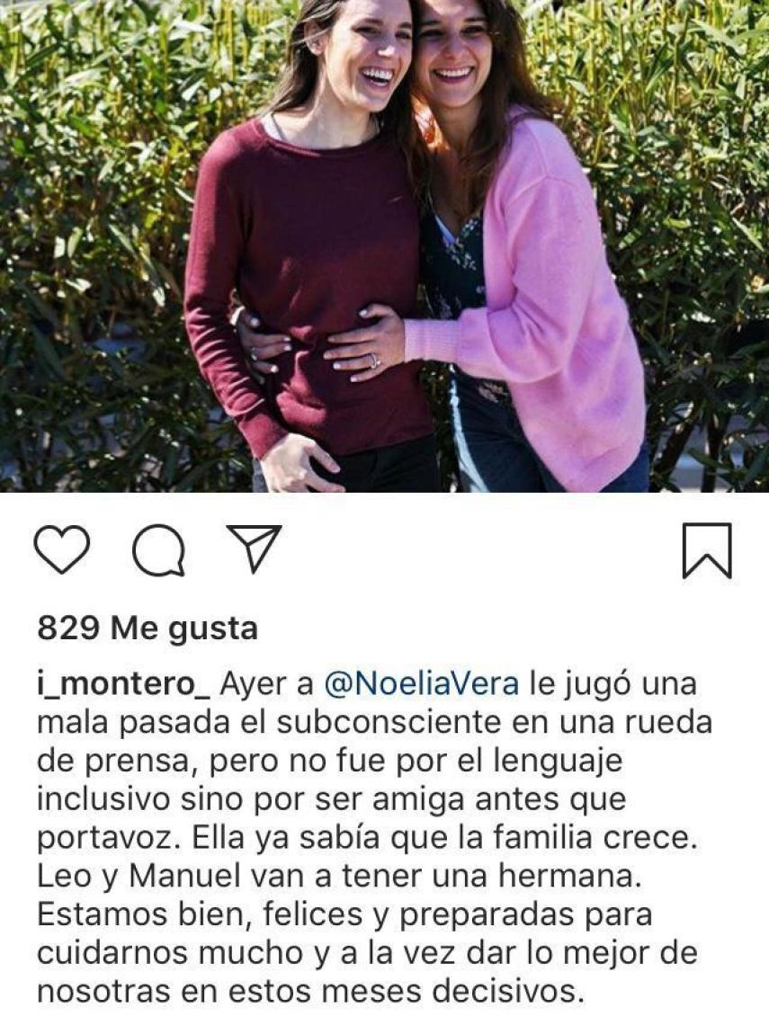 Con una foto en la que sale acompañada de la secretaria de Participación y diputada por Cádiz en el Congreso, Noelia Vera, Montero ha anunciado que sus mellizos, Leo y Manuel, tendrán una hermanita: "Ayer a Noelia Vera le jugó una mala pasada el subconsciente en una rueda de prensa, pero no fue por el lenguaje inclusivo sino por ser amiga antes que portavoz", comenzaba explicando en Instagram.
