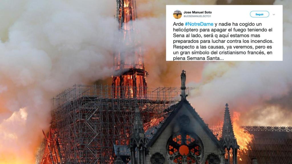 "Es horrible ver el masivo incendio en la Catedral de Notre Dame de París. Quizá podrían usarse unos aviones para apagarlo. ¡Hay que actuar rápido", escribió. El problema es que la solución que proponían podía ser peor que la enfermedad. Poco después del tuit en perfecto inglés de Trump, la Seguridad Civil francesa publicó un tuit en perfecto inglés en el que se le daba un sutil palo al inquilino de la Casa Blanca -y también a Soto, aunque posiblemente no sepan quién es-.