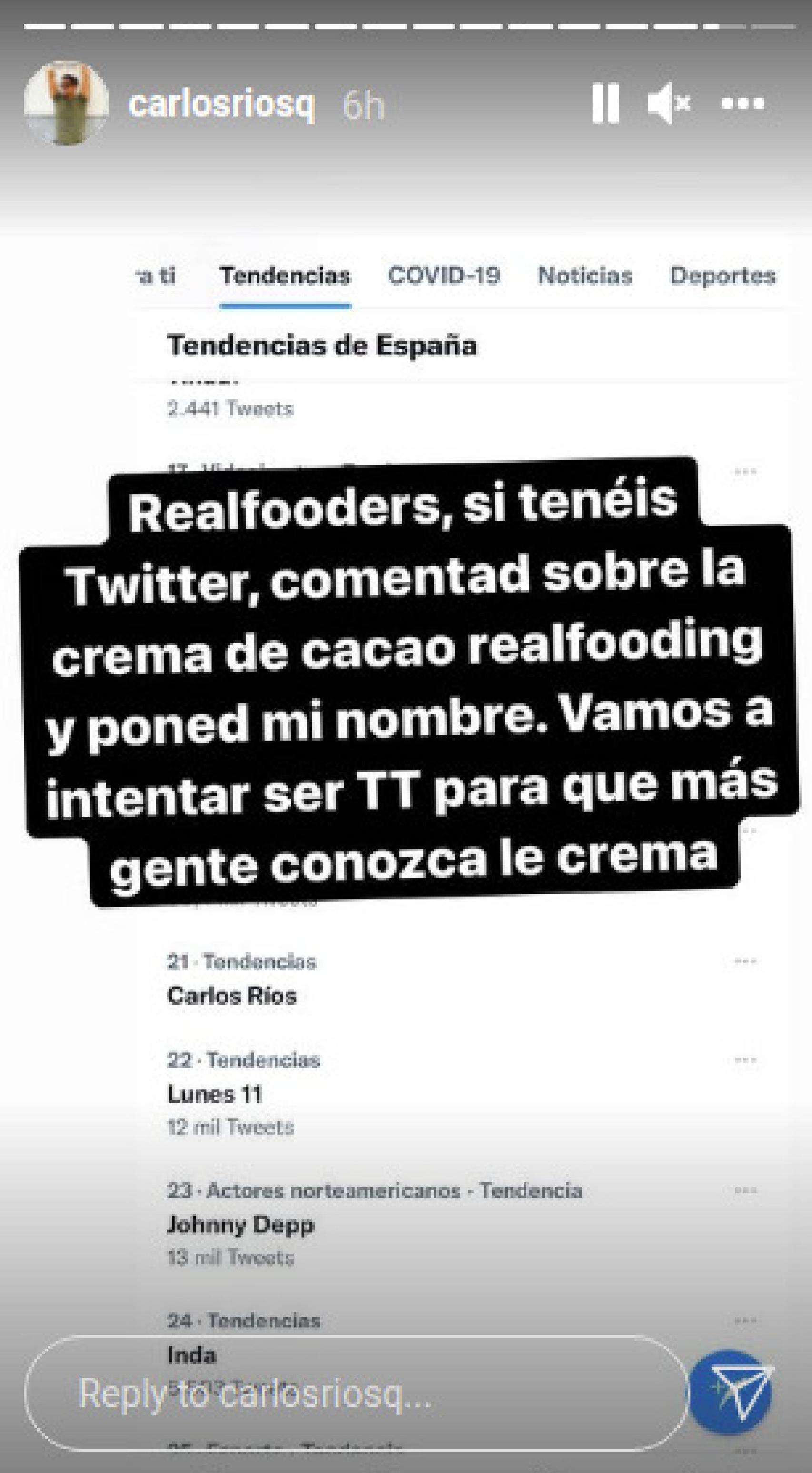 Os voy a explicar la polémica con CARLOS RÍOS y su crema de cacao Realfooding. ABRO HILO👇🏼(a la venta en Alcampo y próximamente en más supermercados, sí, soy Carlos Ríos el que escribe, hola twitter cómo estáis, os mando recuerdos 🤪👋🏻). pic.twitter.com/LzQRG3a52V
