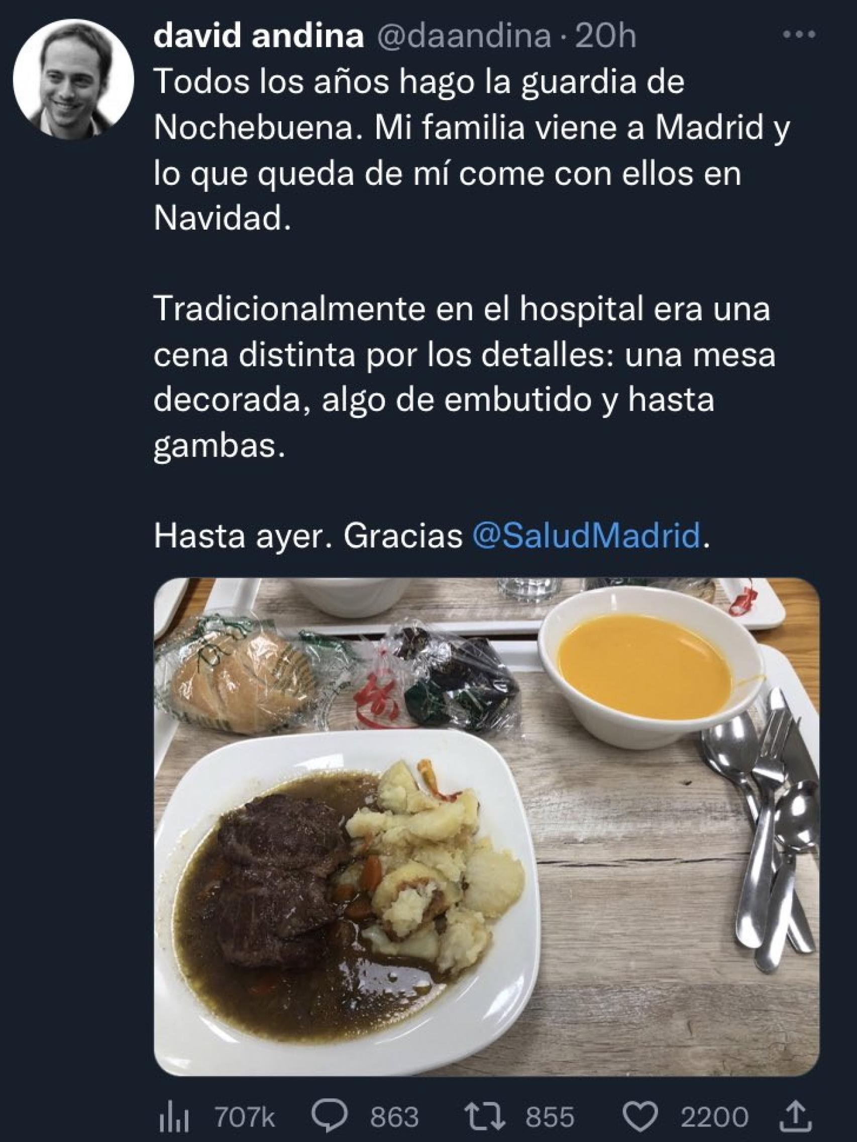 Ha sido después de que Andina haya publicado un tuit contando cómo había empeorado su cena de Nochebuena. Acompañado de una fotografía en la que se veía un menú rutinario, con crema de verduras y algo de carne, explicaba que "todos los años" hacía esa misma guardia porque "si familia viene a Madrid y lo que queda de mí come con ellos en Navidad", lamentando que "tradicionalmente, en el hospital era una cena distinta por los detalles: una mesa decorada, algo de embutido y hasta gambas".