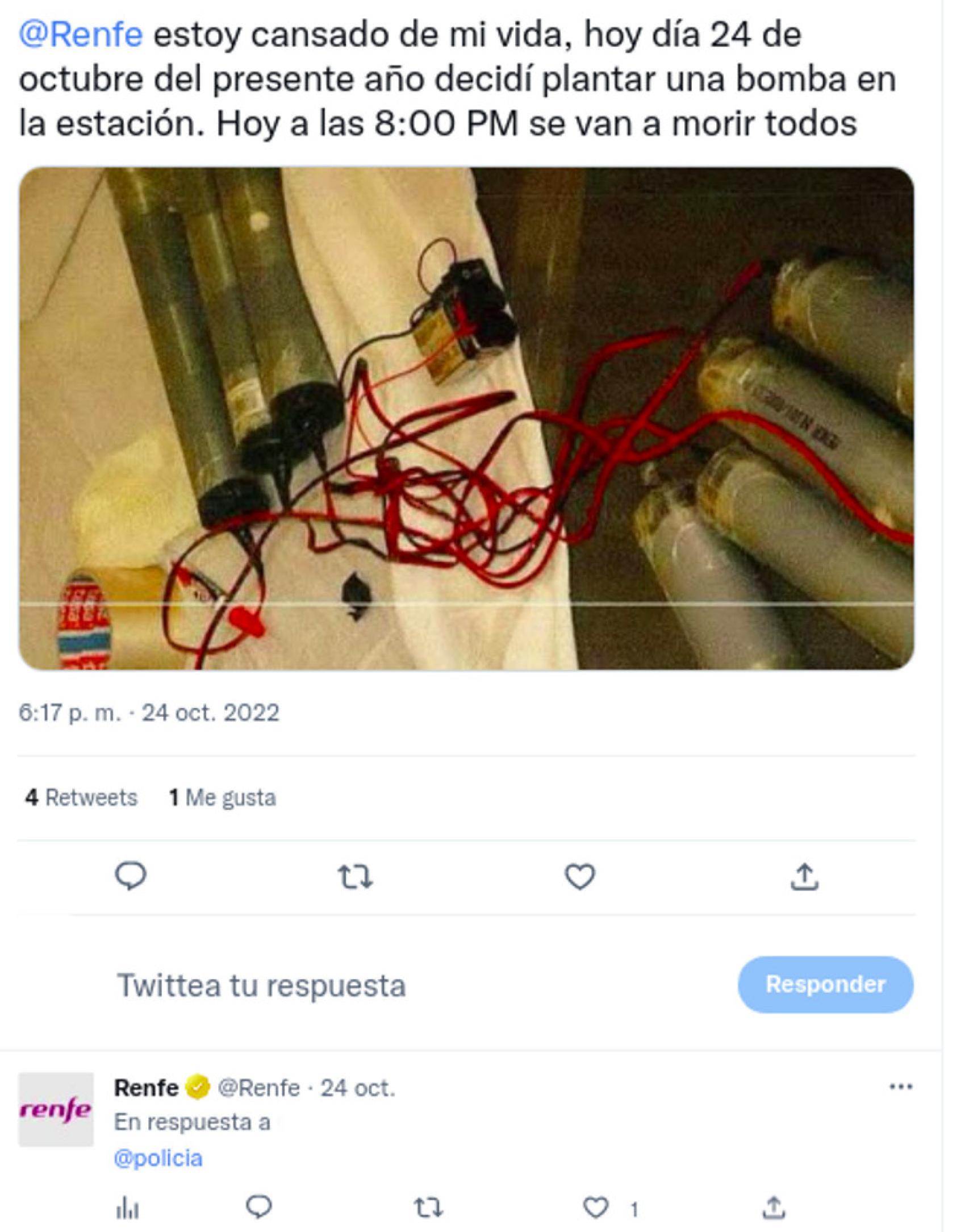 En el tuit anterior amenazan con suicidarse y explotar una bomba en la estación, mientras en este otro advierten que estallarán otra si el tren no llega: