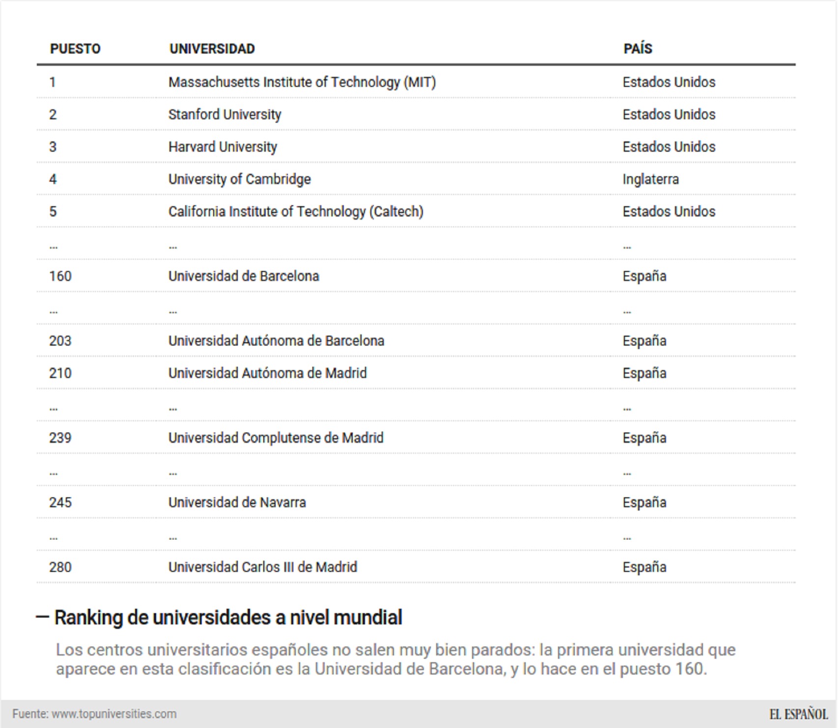 El de QS coloca al centro catalán en la posición 160, subiendo seis escalones con respecto a la edición anterior. Un ascenso que no se repite con las demás universidades que aparecen en el listado, que experimentan considerables descensos, como es el caso de la Autónoma de Barcelona y Madrid y la Complutense. Pero, ¿por qué no sólo no aparecen las universidades españolas en puestos dignos, sino que además las que logran asomar están perdiendo fuelle?
