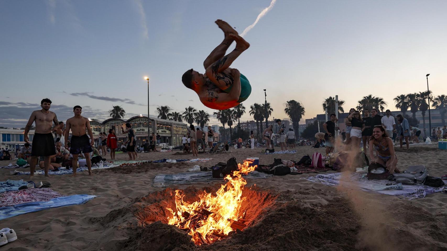 Personas bailan alrededor de una hoguera en el barrio de El Clot, en Barcelona.