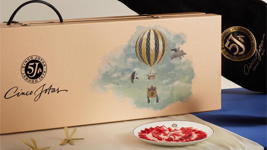 El Maletín Celebración de Cinco Jotas está a la venta de forma exclusiva en tiendas gourmet seleccionadas y en la tienda online de la marca que incluye un jamón Cinco Jotas de entre 6 y 7 kilogramos, media caña de lomo tradicional Cinco Jotas y un cuchillo Arcos. Este pack está decorado con el detalle de la mesa de celebración, una reunión de comensales en torno a estos productos que une pasado, presente y futuro con las sensaciones de degustar y compartir estos productos como nexo.