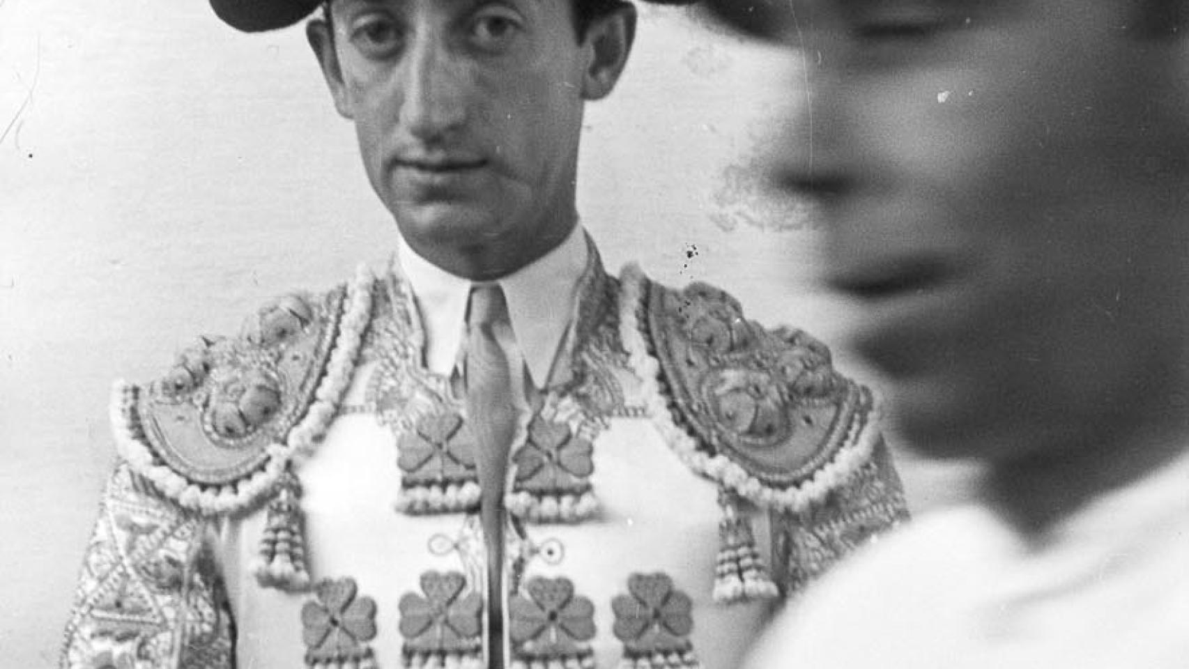 Manolete posa sentado en una fuente del patio de su casa en la Avenida de Cervantes