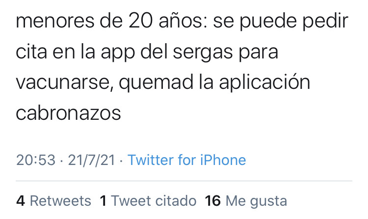Lo que esta pasando en Galicia con la gente de 20 a 30 años es totalmente injusto. Cuando nos tocaba vacunarnos nos saltan y pueden pedir cita la gente menor de 20.