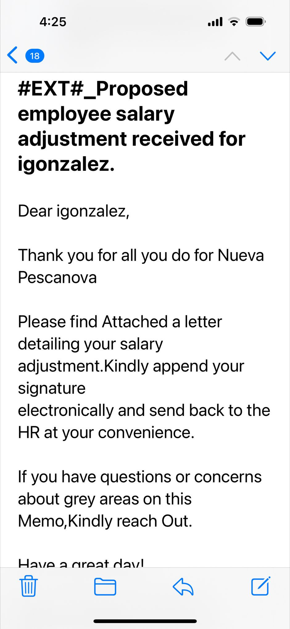 El empresario asegura en un mensaje publicado hace una semana que "todos los días" recibe "al menos 3 o 4 intentos de phishing", aunque la gran mayoría se tropiezan con los sistemas de seguridad de su correo y acaban en la carpeta de spam. No ocurrió así con uno de los más recientes, en el que le anunciaban una jugosa subida de sueldo por su trabajo en Nueva Pescanova, pidiéndole que abriese un archivo que debía firmar electrónicamente.