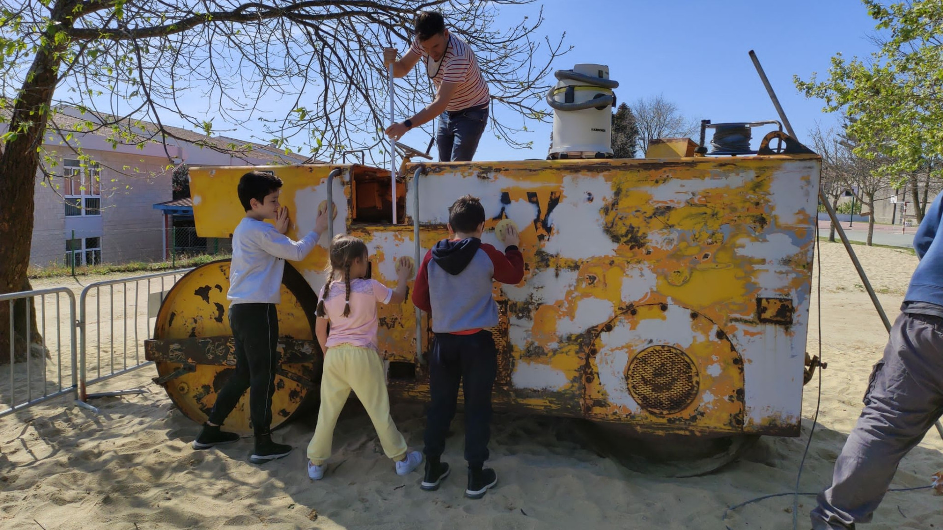 Un colegio de Nigrán (Pontevedra) convierte una vieja apisonadora en un singular tobogán