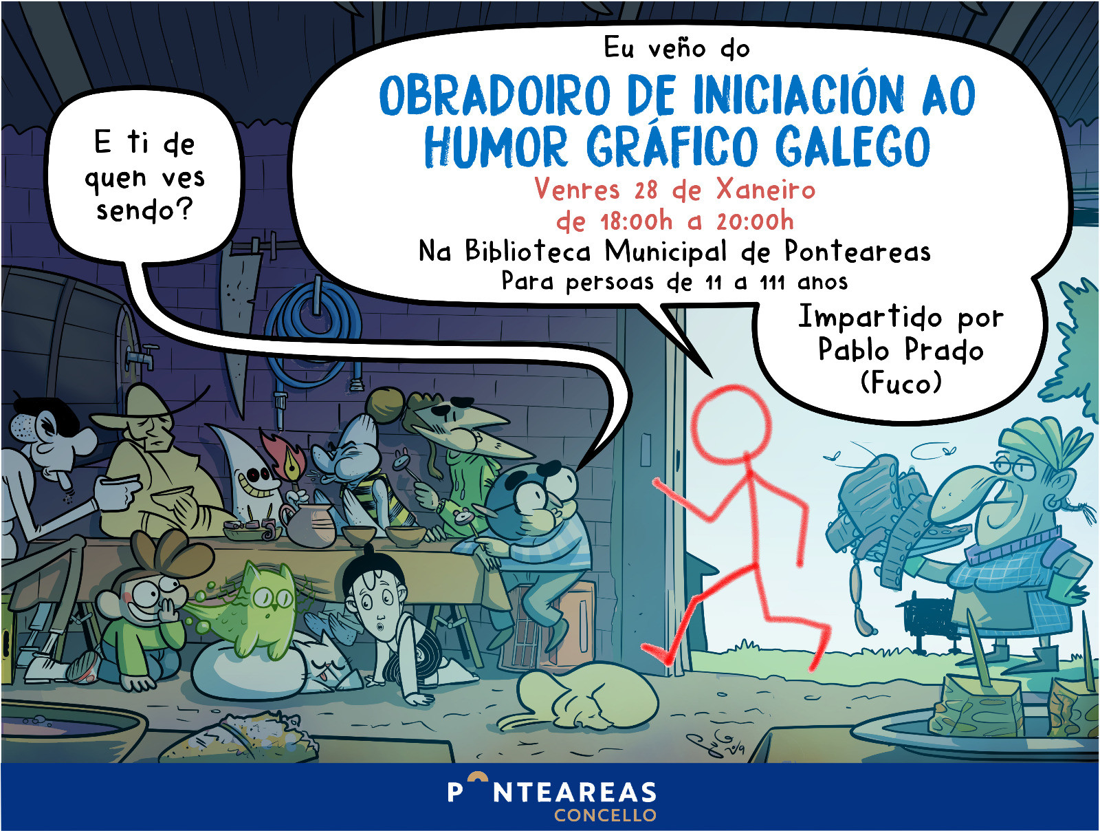 Ponteareas continúa esta semana con las actividades en homenaje al maestro Castelao. Esta semana el Ayuntamiento organiza un original taller de iniciación al humor gráfico gallego impartido por el dibujante y diseñador afincado en Ponteareas Pablo Prado, Fuco, ganador del premio de cómic de O Garaxe Hermético con Nerea y el príncipe de la Suerte, un trabajo con guión de Miguel Rojo y publicado por la editorial Xerais.