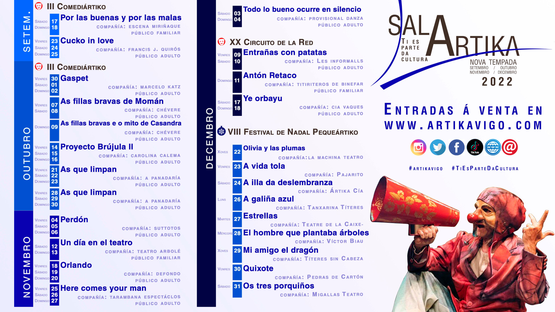 En diciembre la sala acogerá también el XX Circuito de Creación escénica contemporánea para público adulto y familiar organizado por la Red de Teatros Alternativos e ideado con el objetivo de facilitar la gira de compañías por las salas alternativas asociadas; la sala Ártika será el único espacio en Galicia que acoge este tipo de propuestas escénicas.