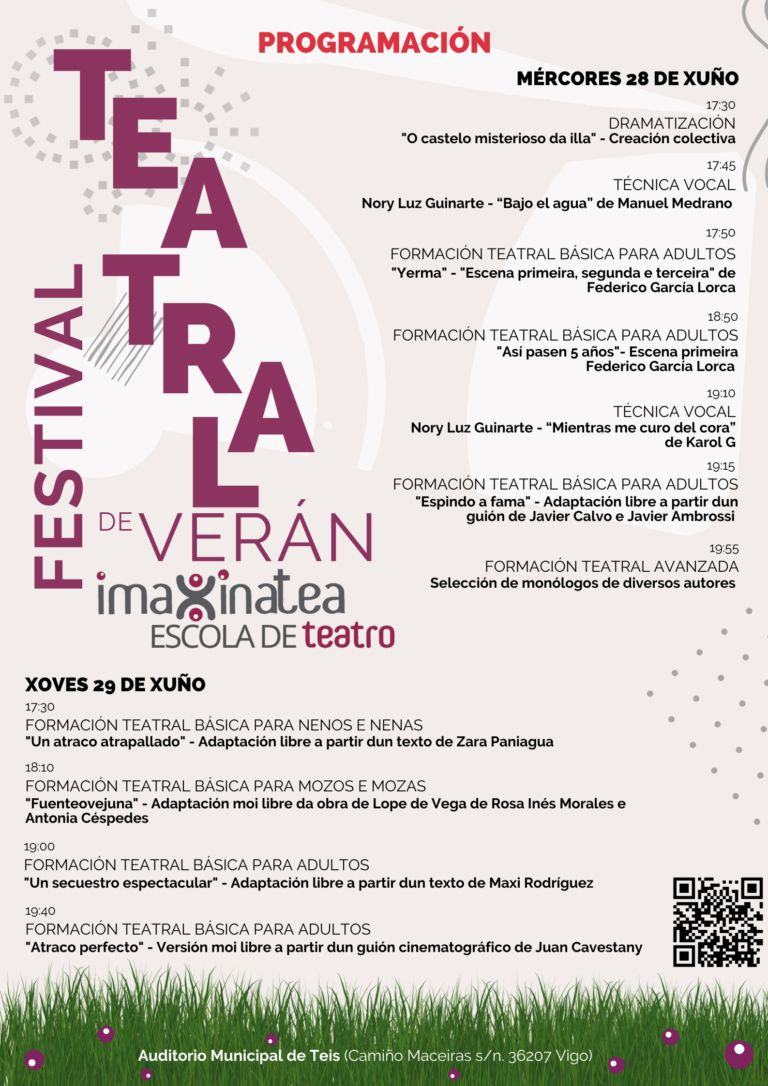 El Auditorio Municipal de Teis acogerá el Festival Teatral de Verán Imaxinatea Lab Creativo. El encuentro tendrá lugar el miércoles 28 de junio y el jueves 29, y en él se expondrán los trabajos que los alumnos y alumnas de las escuela de teatro han ido desarrollando a lo largo de este curso 2022/2023.