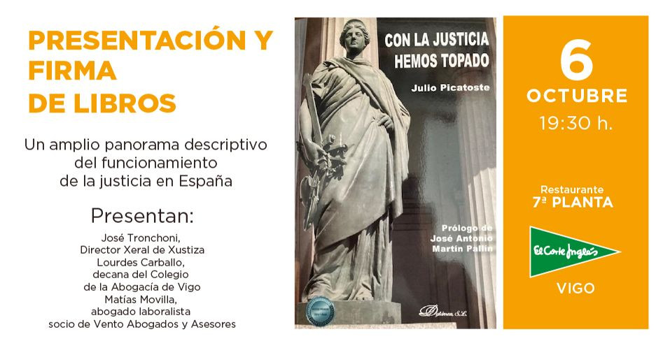 Julio Picatoste, magistrado jubilado y académico de número de la Real Academia Gallega de Jurisprudencia y Legislación, presentará este viernes 6 de octubre su último libro, Con la justicia hemos topado, en El Corte Inglés de Vigo a partir de las 19:30 horas.