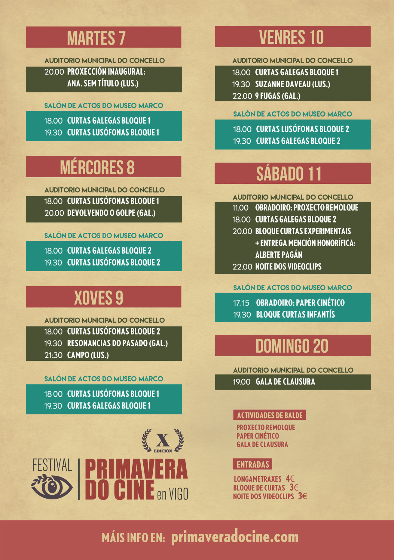 El X Festival Primavera do Cine arrancará este martes en Vigo y, hasta el domingo, permitirá disfrutar de cortometrajes, videoclips y largometrajes, que serán proyectados en el auditorio del Museo Marco y en el auditorio municipal del Ayuntamiento.