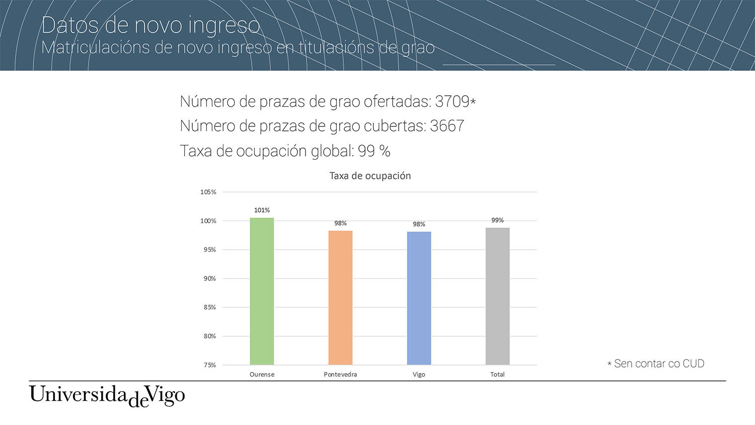 3.709 plazas de nuevo ingreso (1.974 en Vigo, 1.015 en Ourense y 720 en Pontevedra) en 62 titulaciones de grado, sin incluir a las del Centro Universitario de la Defensa, ofertó este curso 2022-2023 la Universidad de Vigo. De ellas, 3.667 quedaron cubiertas, lo que sitúa la tasa de ocupación en el 99%, siendo el campus de Ourense con un 101% (1021 plazas cubiertas) lo que mayor tasa alcanzó, seguido de los de Vigo (1938) y Pontevedra con un 98% (708). En cuanto a la distribución por género, de las 3.667 personas matriculadas en el primero curso de las 62 titulaciones de grado ofertadas, 1.934 (53%) son mujeres y los 1.733 restantes (47%), hombres.