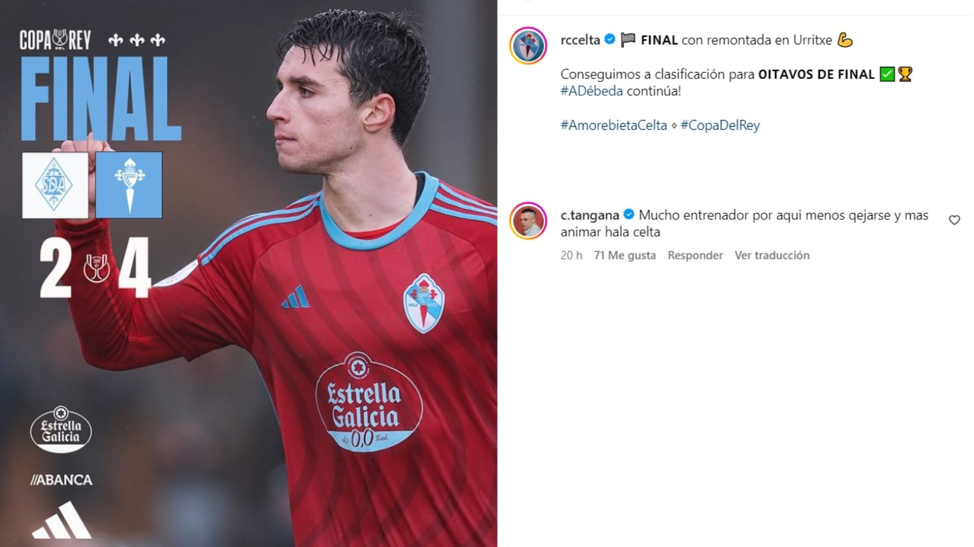 Tras el encuentro de Copa disputado ante el Amorebieta, que finalizó con victoria celtista por 2-4 y que supuso el pase a octavos de final de la competición donde se enfrentará al Valencia, C. Tangana comentó la publicación del Celta en Instagram con el resultado final: "Mucho entrenador", espetó el cantante, que pidió a los aficionados "menos quejarse y más animar", para rematar con un "hala Celta".