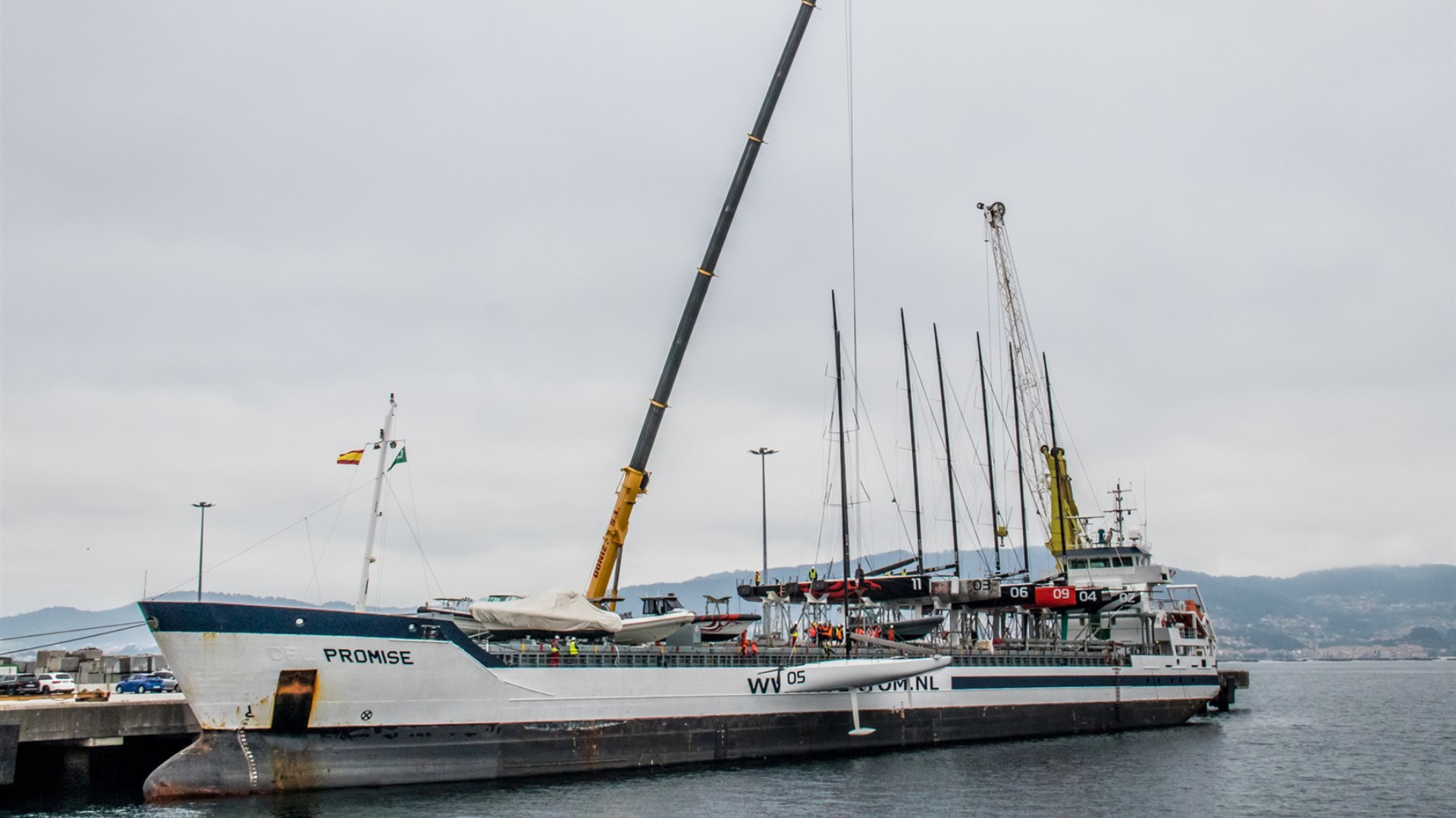 Bajo la supervisión de la compañía logística Peters & May, encargada de traerlos a Galicia desde el puerto de Sagunto (Valencia) a bordo de un carguero, los veleros fueron descargados uno a uno hasta tocar las aguas de las Rías Baixas.