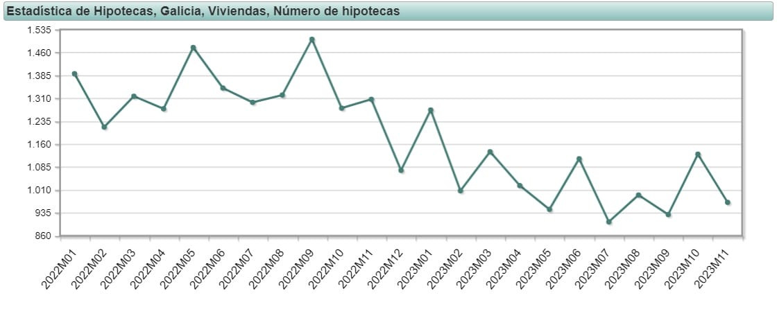 La formalización de hipotecas sobre vivienda en Galicia durante el año 2023 sufrió un descenso generalizado, según los datos del Instituto Nacional de Estadística. El último mes del que se tienen registros es noviembre de 2023, cuando las hipotecas cayeron en la comunidad gallega un 25,8% si se comparan con el mismo mes de 2022.