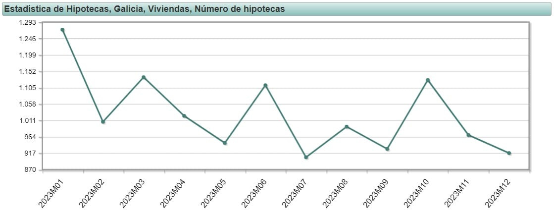 En la comunidad gallega se formalizaron, durante el pasado ejercicio, un total de 12.336 hipotecas. En el mes de diciembre, con el segundo peor dato mensual del año, se constituyeron 917, un 14,5% menos que en el mismo mes de 2022