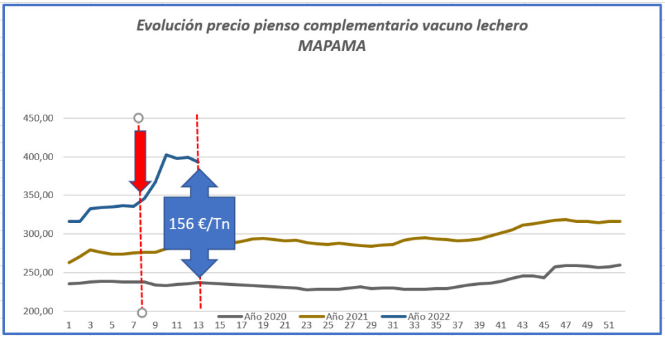 Según datos del Ministerio de Agricultura y Pesca, Alimentación y Medio Ambiente (Mapama), en la semana 7 de este año (antes de estallar el conflicto ruso-ucraniano), el precio de un concentrado de vacuno lechero