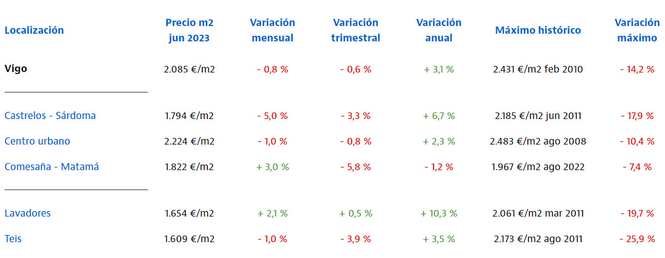 Por su parte, las áreas más baratas de la urbe están conformadas por los barrios de Lavadores y Teis, donde el precio por metro cuadrado registrado en el mes de junio fue de 1.654 y 1.609 euros, respectivamente. Estas dos localizaciones fueron, sin embargo, las únicas que sufrieron un incremento mensual del precio de la vivienda de segunda mano, un 2,1% y un 3% mayor al del mes de mayo de 2023.