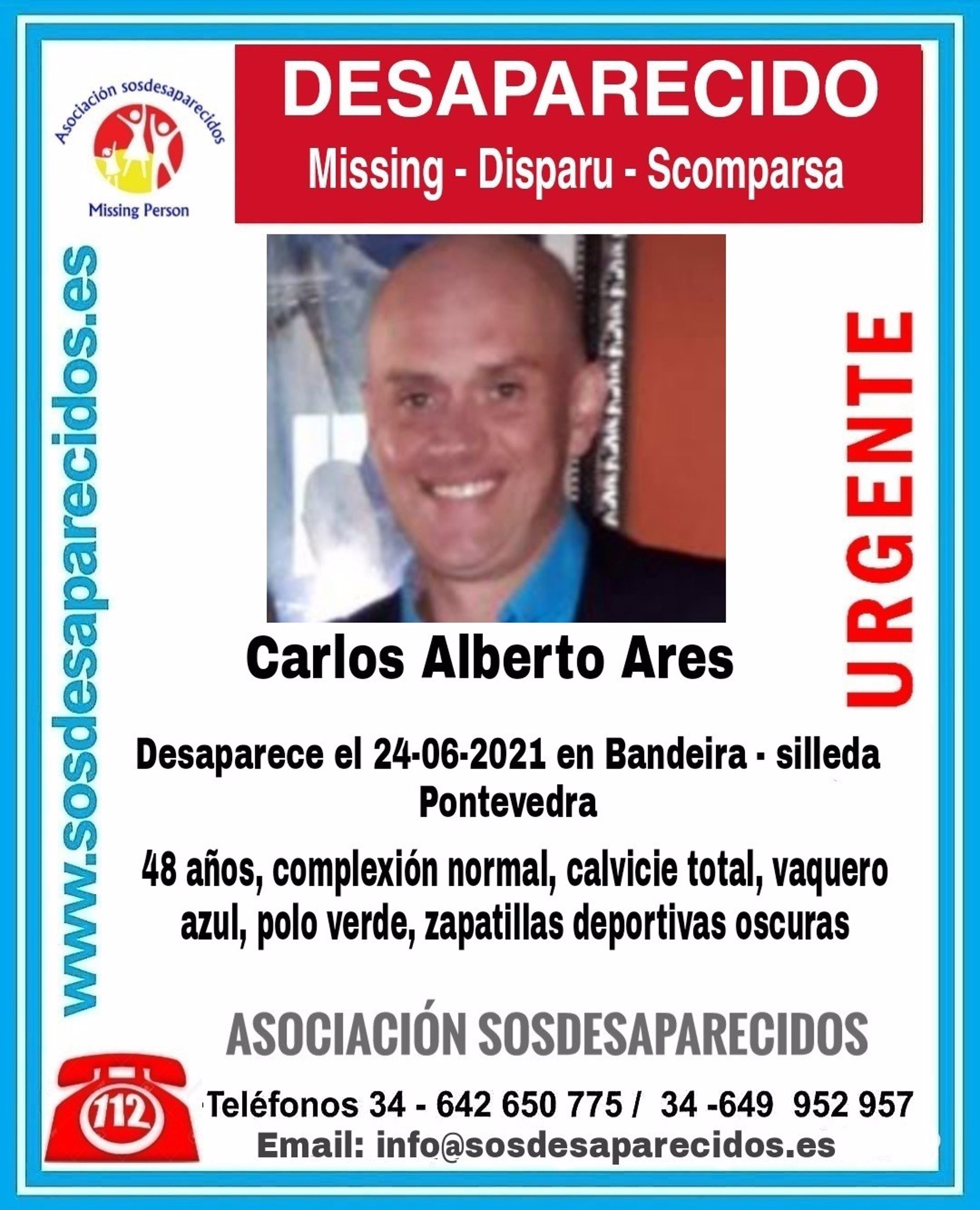 Según el cartel de alerta que ha compartido en redes sociales la asociación SOS Desaparecidos, se trata de Carlos Alberto Ares, un hombre de 48 años y vecino del lugar de Bandeira de complexión normal y con calvicie total.