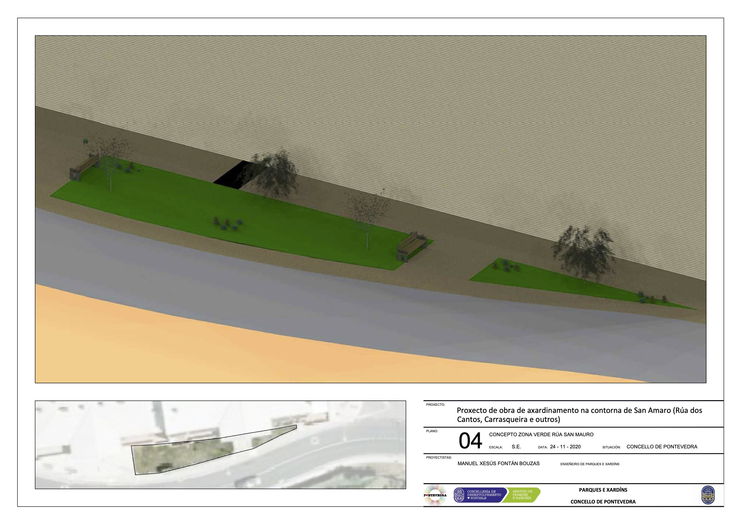 La Concellería de Desenvolvemento Sostible e Medio Rural del Concello de Pontevedra acaba de poner en marcha en una zona verde que hay entre las calles San Amaro y Carrasqueira un proyecto de ajardinamiento y renovación paisajística valorado en 24.694,45 euros que se extenderá por todos los jardines existentes entre el primer trecho de la carretera autonómica a Ponte Candelas (PO-532) y su cruce con la avenida Virxinia Pereira.
