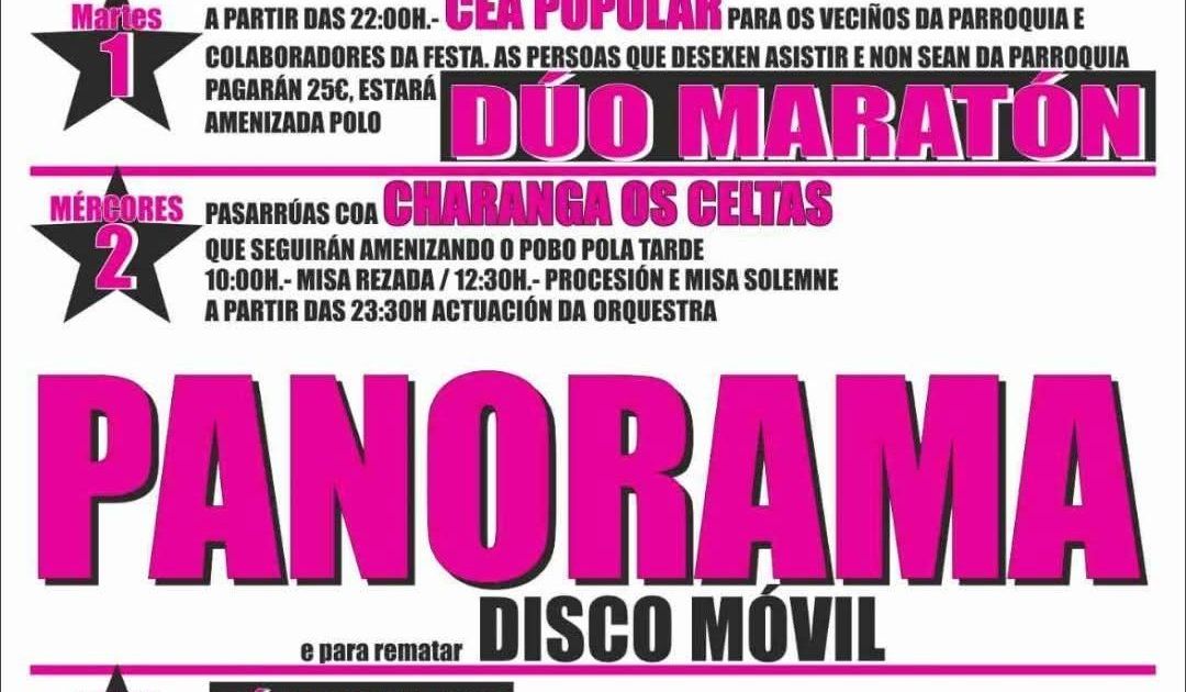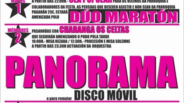 Tres días de celebración con gastronomía popular, charangas, actos religiosos, juegos para niños y grandes verbenas con destacadas orquestas del panorama gallego.