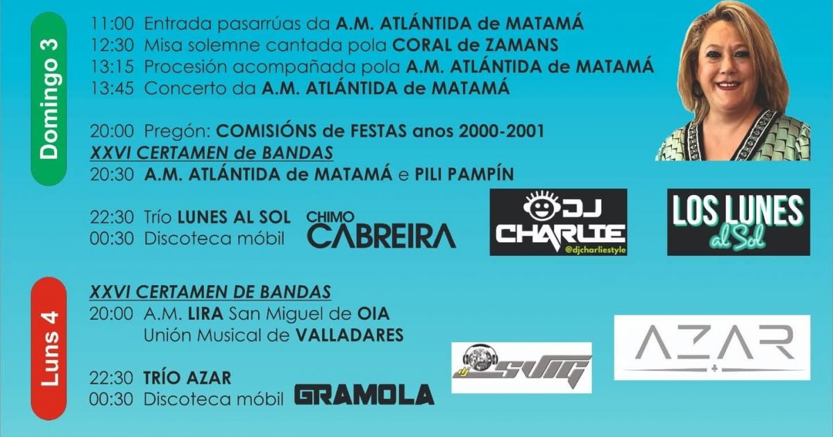 - 20:30h: XXVI Certamen de Bandas, A.M. Atlántida de Matamá y Pili Pampín