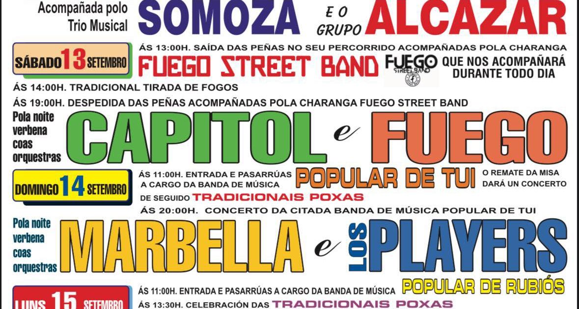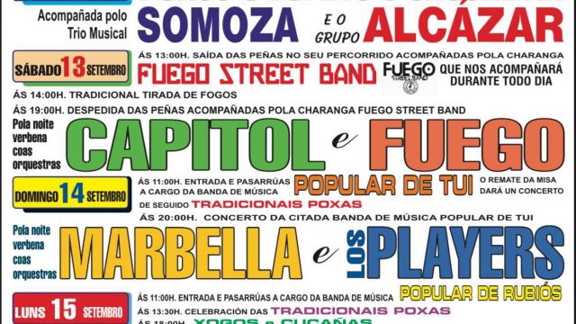 - Domingo 14: Misa solemne a las 13:00 h, cantada por la Coral de Pereiras, seguida de procesión con Banda de Música Popular de Tui