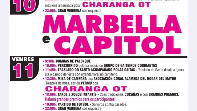 - 22:00h: Gran verbena con las orquestas Marbella y Capitol