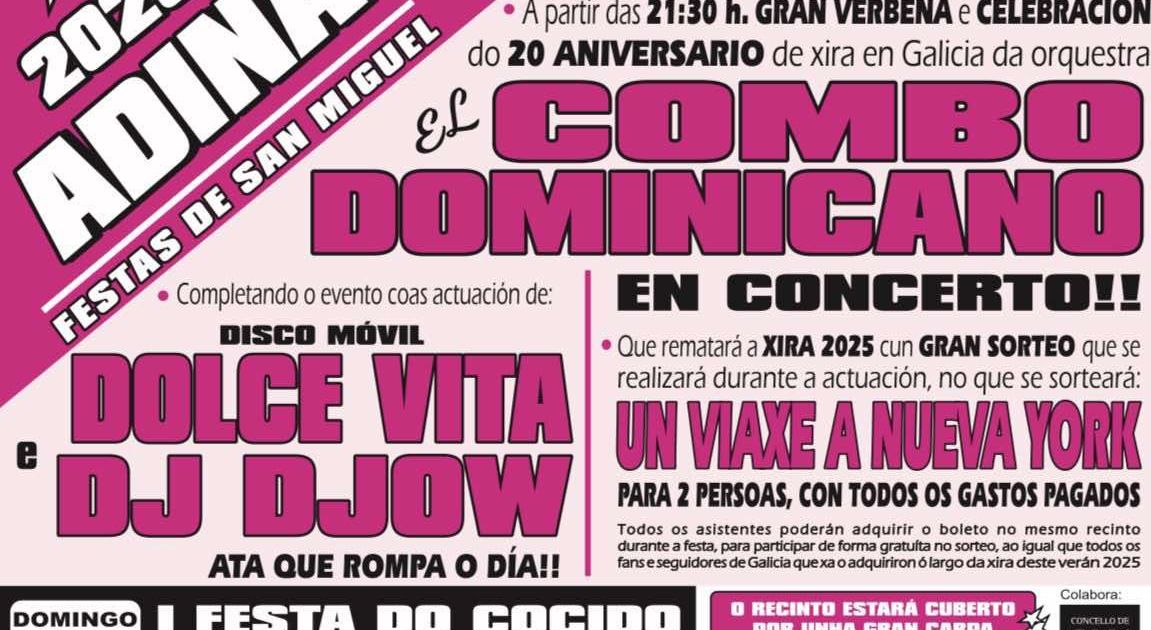 - 21:30 h → Gran verbena y celebración del 20º aniversario de gira en Galicia de la orquesta El Combo Dominicano, en concierto.