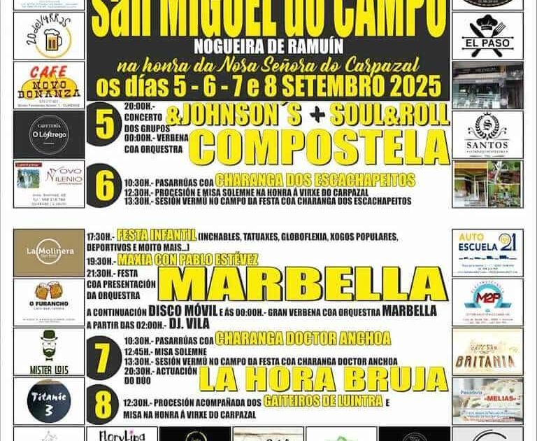 San Miguel do Campo celebrará sus festas patronais en honor a la Nosa Señora do Carapazal con un programa variado que incluye procesiones, música, verbenas, actividades infantiles y sesiones vermú con charangas y orquestas reconocidas.