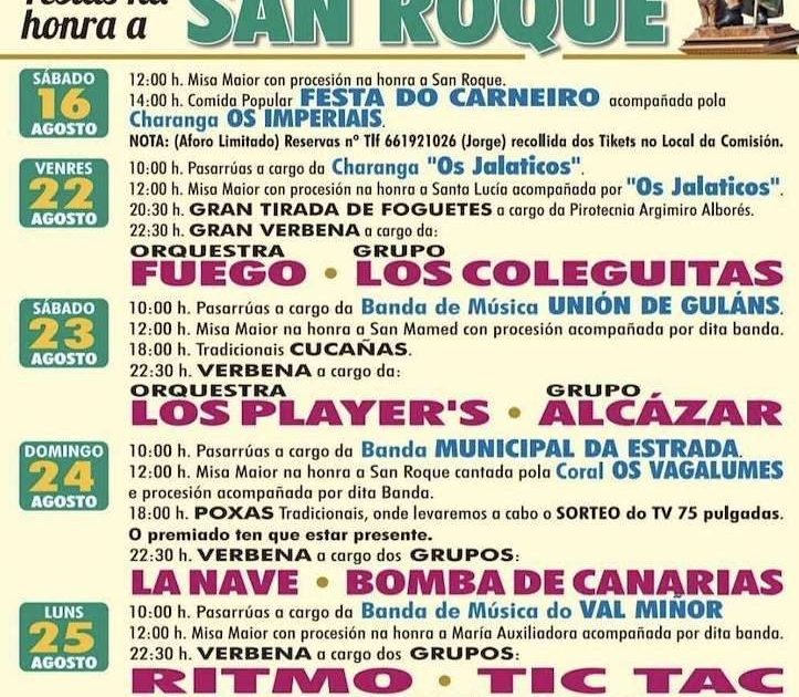- 12:00 h: Misa mayor en honor a San Roque cantada por la Coral Os Vagalumes y procesión