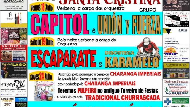 La parroquia de Valeixe celebra sus fiestas patronales en honor a Santa Cristina con verbenas, misas, pasacalles, pulpo, churrascada y grandes orquestas. Una cita imprescindible del verano cañicense.
