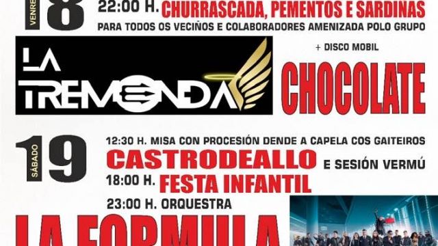 - 23:00h: Gran verbena con orquesta La Fórmula y Disco móvil Chocolate