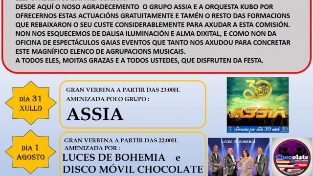 La Comisión de Festas da Virxe do Carme de Cesantes reprograma sus fiestas tras la suspensión inicial por causas meteorológicas. Con agradecimiento especial a las orquestas Assia y Kubo por actuar gratuitamente, y a todas las formaciones por su implicación, las fiestas contaran con un excelente cartel musical.