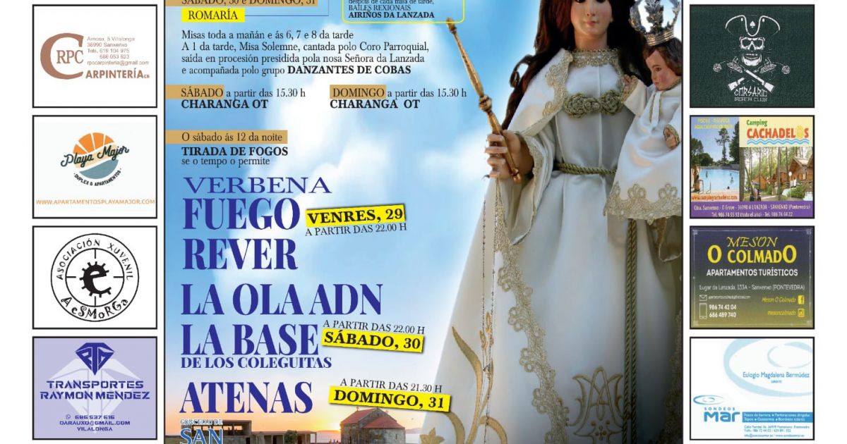 - 13:00 h: Misa Solemne cantada por el coro parroquial, seguida de procesión presidida por la imagen de la Virgen de A Lanzada, acompañada por el grupo de danzas Danzantes de Cobas