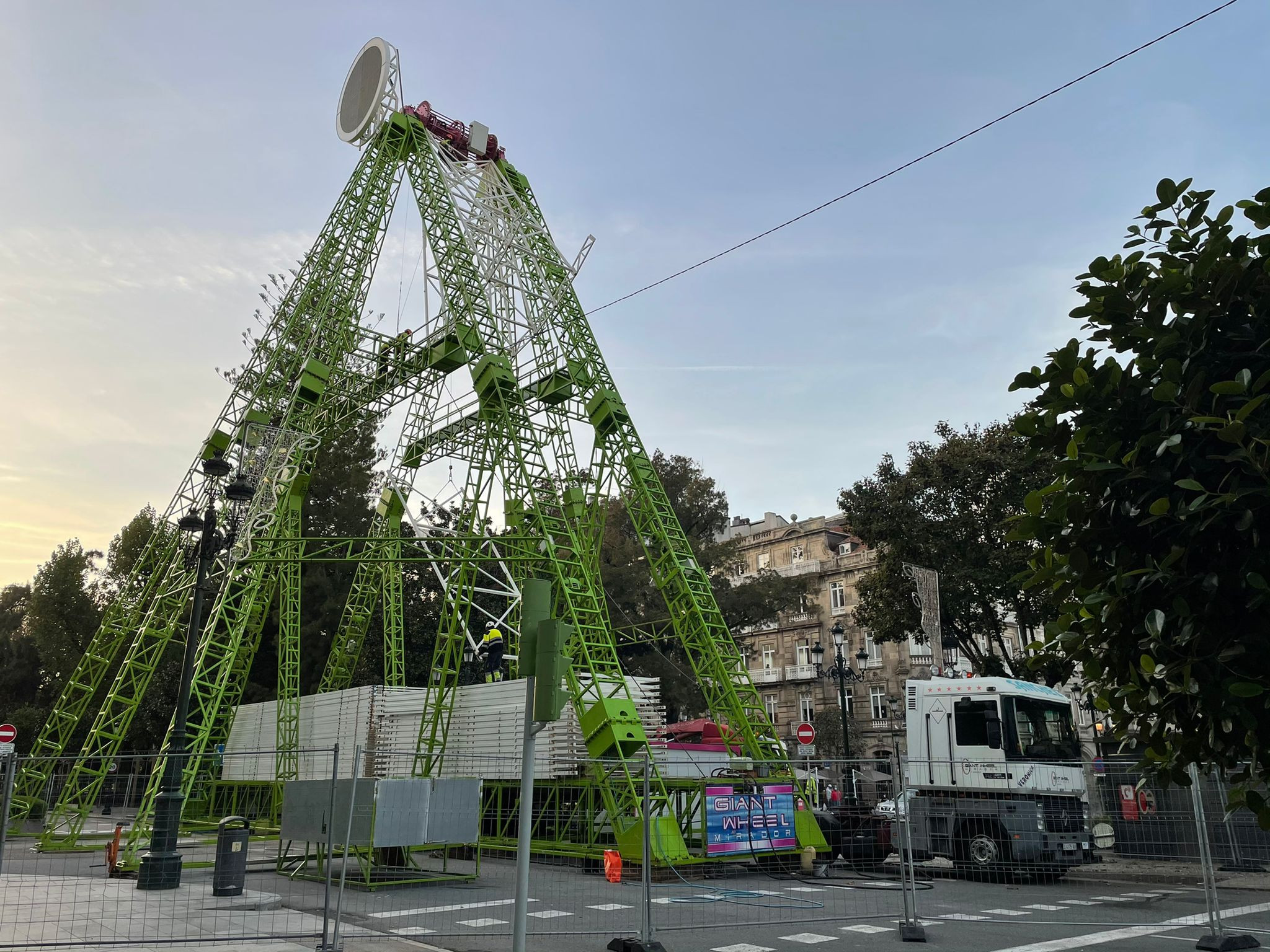 El montaje de la gran noria, cuya primera y única edición hasta la fecha fue en 2019, vuelve a cortar al tráfico una de las principales vías de la ciudad. Se trata del cruce de las calles Colón y Arenal, junto a la plaza de Compostela de la ciudad olívica.