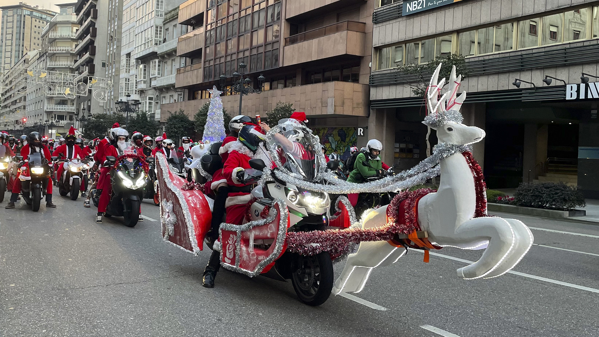 Después de cancelarse el año pasado por la pandemia, la Papanoelada motera de Vigo volvió a rugir a su paso por las calles de la ciudad olívica. Con cierto retraso con respecto a la hora oficial, miles de papanoeles en moto se lanzaron a recorrer la ciudad sobre dos ruedas, repartiendo caramelos entre los más pequeños.