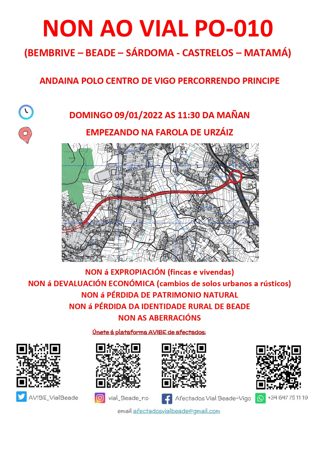 La convocatoria de la Plataforma de afectados por el nuevo vial de alta capacidad de cuatro carriles en Beade (Avibe) se llevará a cabo en el centro de Vigo a las 11:30. La Farola de Urzaiz será el punto de encuentro para, a continuación, recorrer la calle Príncipe.
