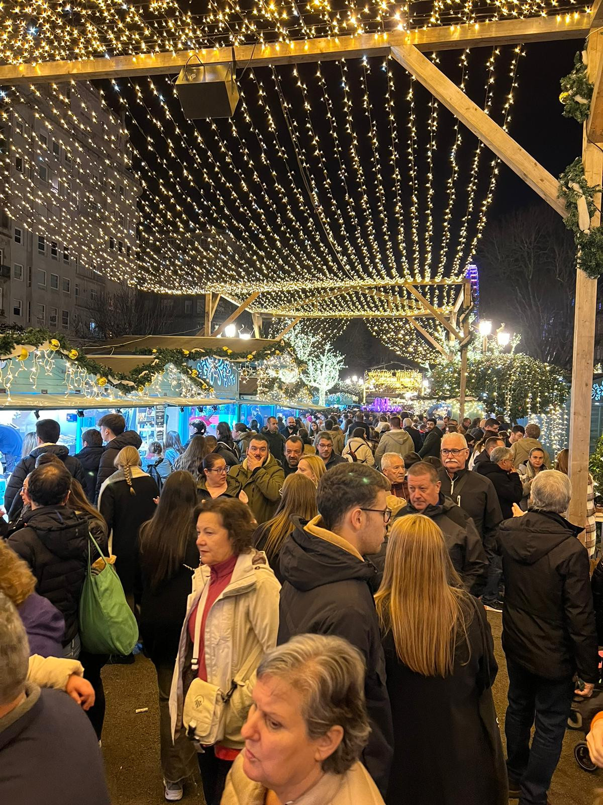 Cuando comienza a caer la noche y se enciende el alumbrado navideño en Vigo también comienza la procesión de vehículos que entran en la ciudad. Se juntan en los accesos y viales del centro urbano tanto los visitantes de otros lugares como los vigueses que vuelven del trabajo o salen hacia él, provocando retenciones kilométricas. Además, los aparcamientos más céntricos presentaban este martes el cartel de "completo" desde primera hora de la tarde.