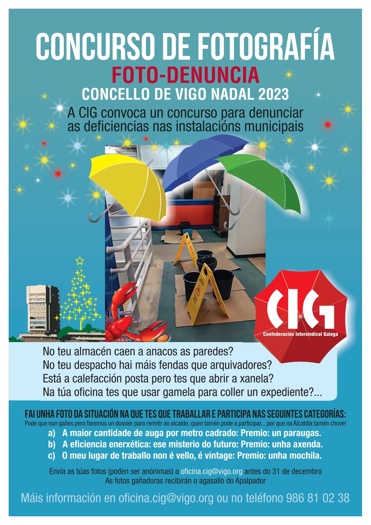Un concurso fotográfico con premios para denunciar las deficiencias de las instalaciones municipales de Vigo. Esta es la curiosa iniciativa de la sección sindical de la CIG en el Concello de Vigo que tiene el objetivo de poner de relieve, tras reiteradas quejas, el estado de abandono en el que se encuentran muchas dependencias.