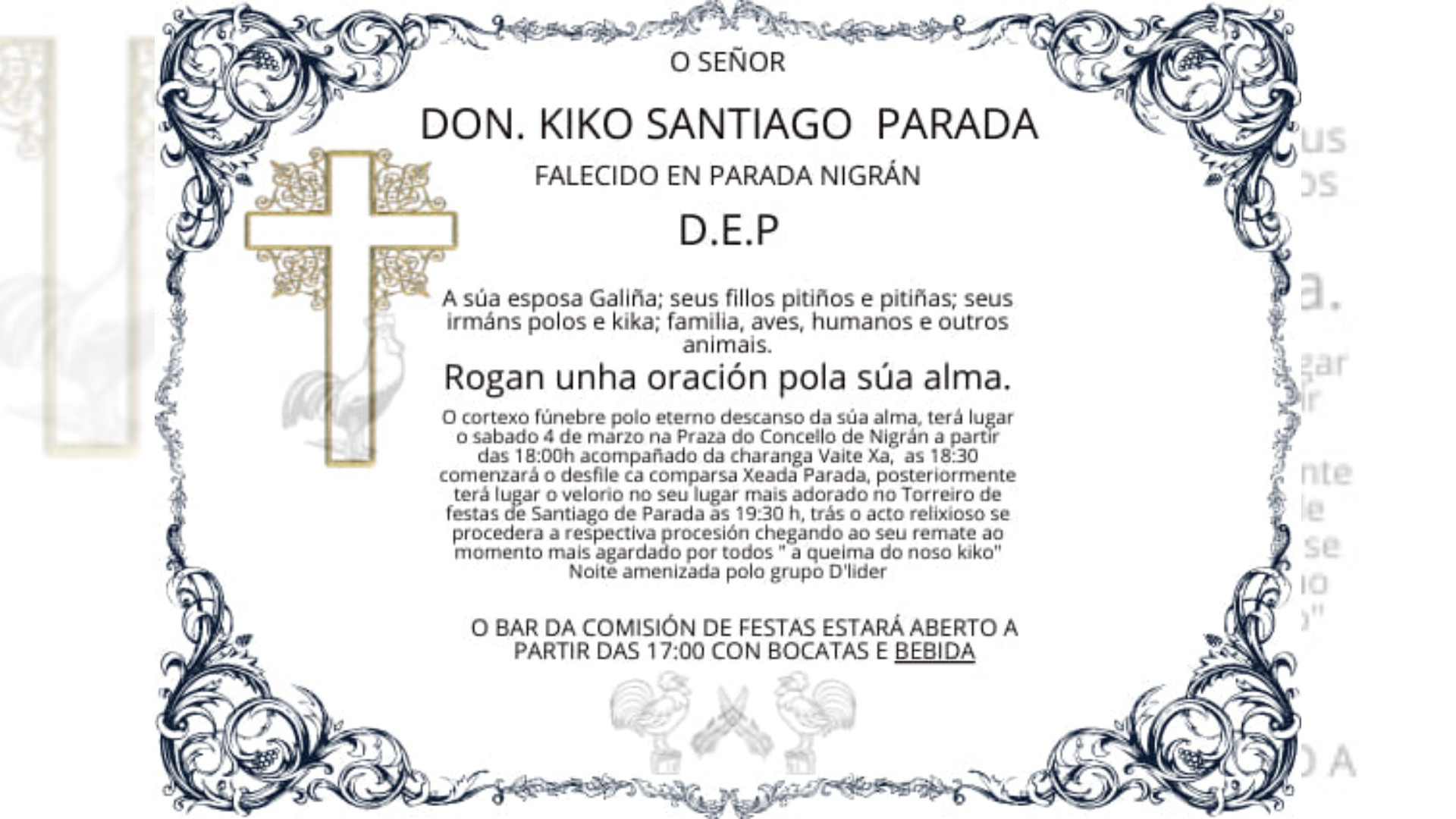 El pregonero Antonio oficiará un funeral en el Torreiro, donde el "kiko" será velado a partir de las 19:30 horas. A continuación se celebrará la procesión por el barrio de la Iglesia y, finalmente, la quema del "kiko". La jornada rematará con el concierto de D´Lider (Prosy y María Rúa), previsto para las 21:30 horas.