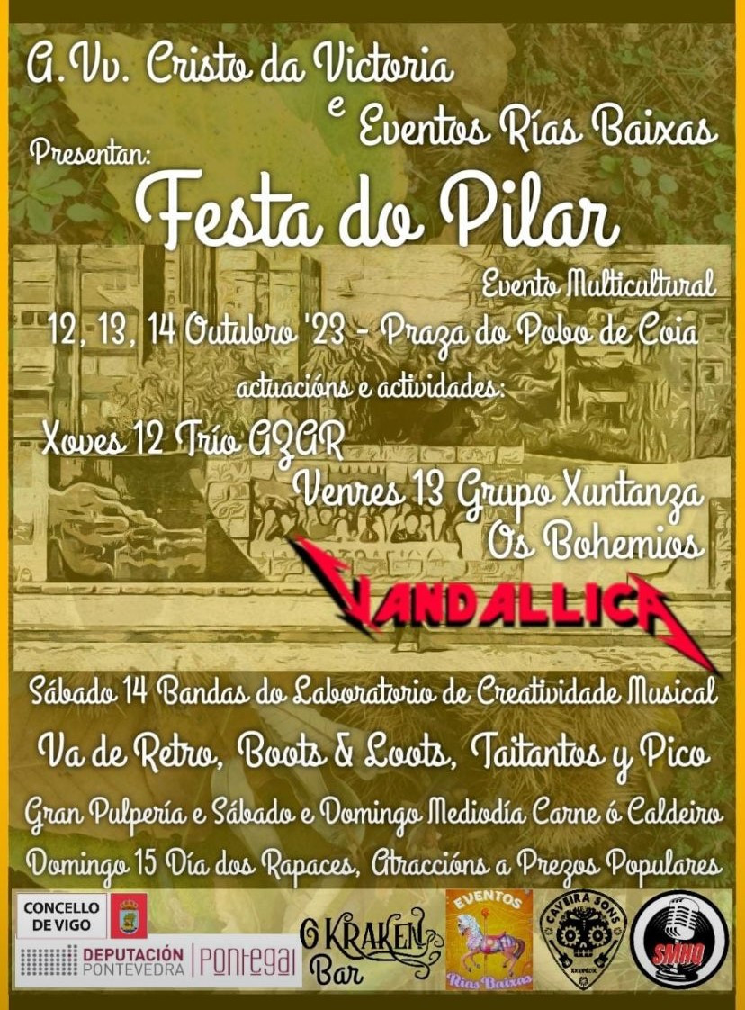 Por otro lado, el viernes hay programados tres conciertos de la mano de Grupo Xuntanza, Os Bohemios y Vandallica, banda tributo a Metallica. La música comenzará a sonar hacia las 20:00 horas. El sábado 14 de octubre actuarán varios grupos del Laboratorio de Creatividad Musical de Vigo: Va de Retro, Boots & Loots y la banda Tantos y Pico.