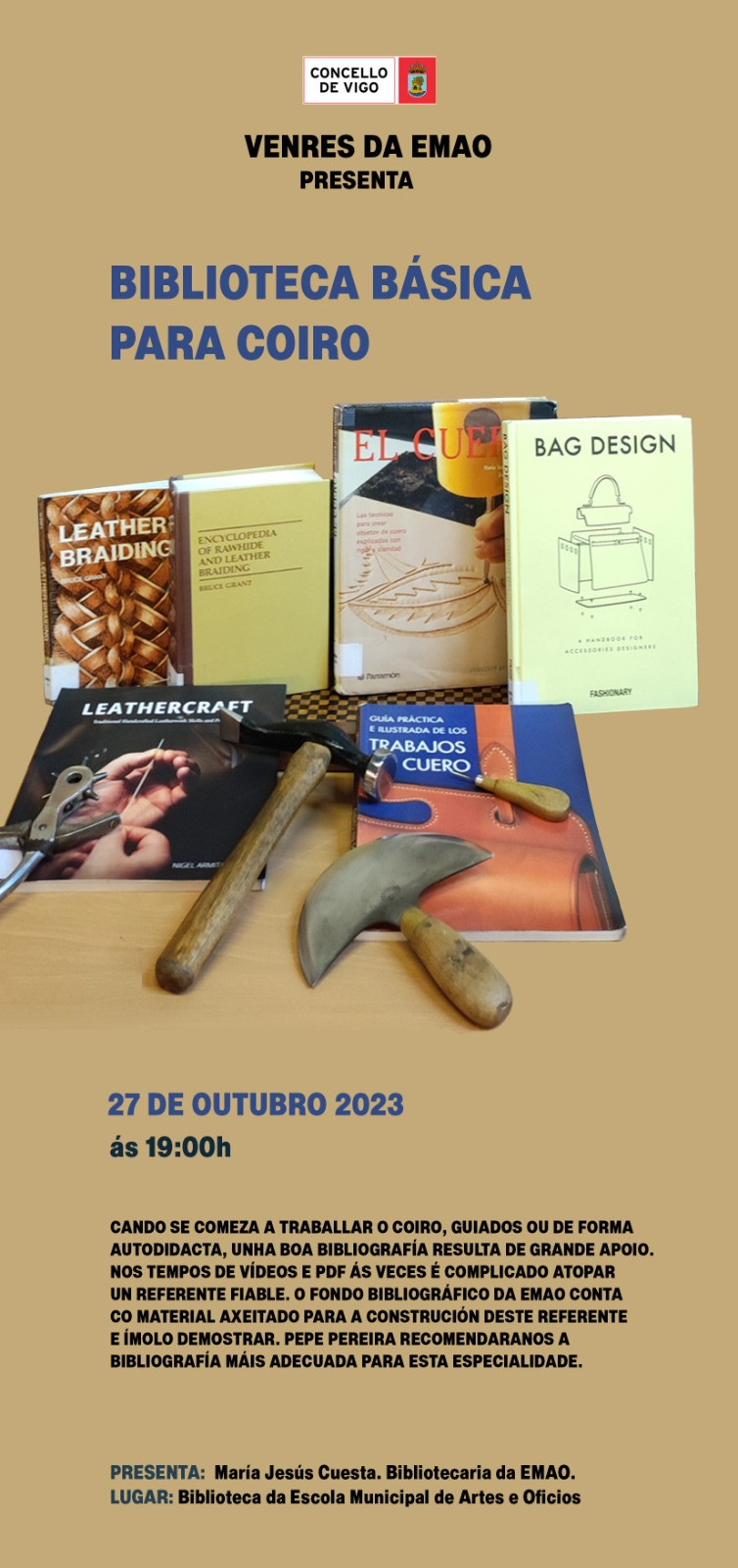 Promovido por la Escola Municipal de Artes e Oficios de Vigo, la biblioteca de la entidad ofrecerá la presentación de una bibliografía especial para el trabajo con el cuero. Los responsables de la escuela atesoran un fondo bibliográfico para comenzar a desenvolverse en esta disciplina.