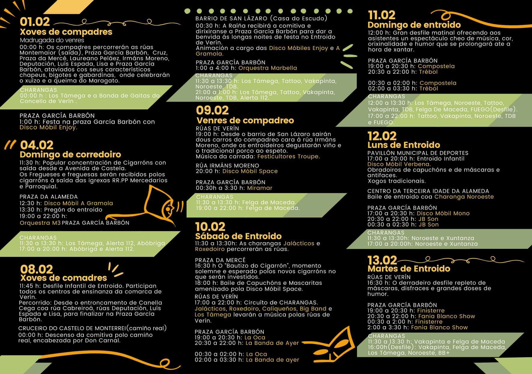 El Entroido de Verín 2024 (declarado de interés turístico nacional) se desarrollará los días 1, 4, 8, 9, 10, 11, 12 y 13 de febrero, con un total de 50 actuaciones de música itinerante, 10 orquestas en directo y cinco discotecas móviles, como ha destacado la edil de Turismo. Este año se ha querido potenciar la programación infantil y por ello, el Luns de Entroido (12 de febrero) la tarde estará plagada de talleres temáticos, como de elaboración de máscaras y capuchones, juegos populares y animación musical.