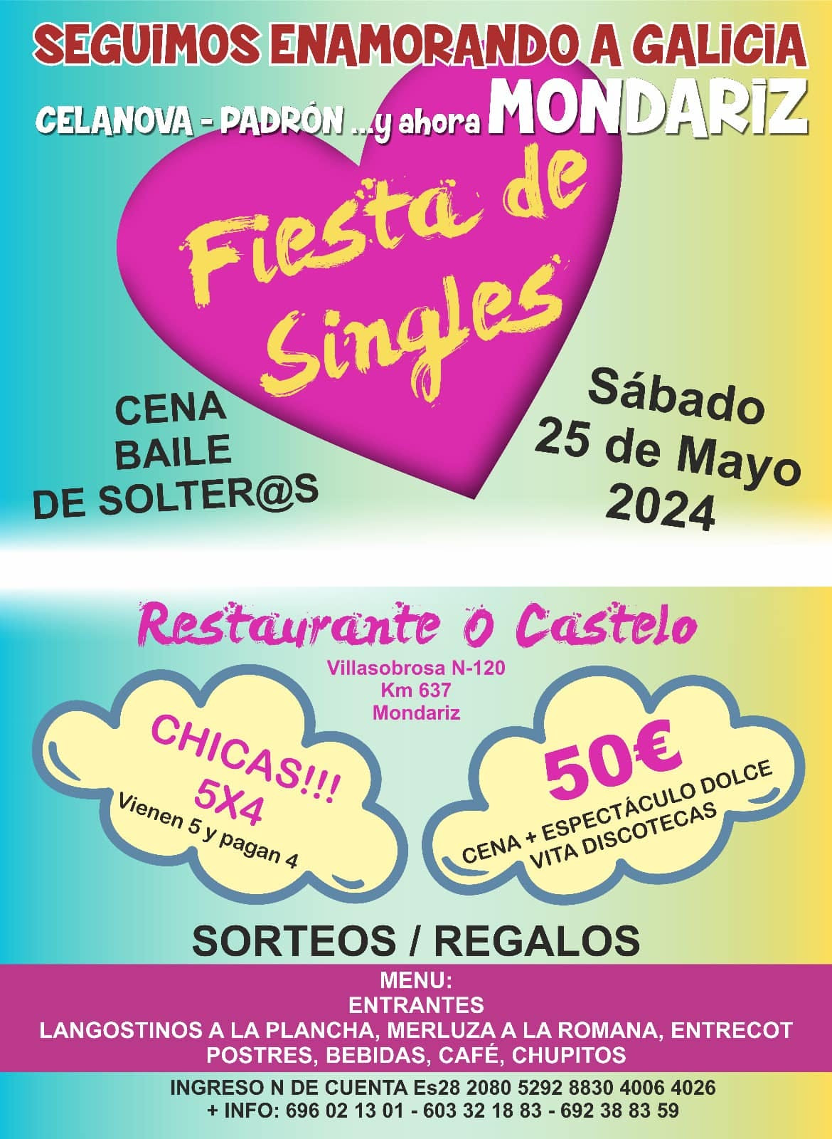 La nueva Fiesta de Singles tendrá lugar este sábado 25 de mayo en el restaurante O Castelo, ubicado a la altura de Vilasobroso en la N-120. La cita incluye cena (el menú trae entrantes, langostinos, merluza, entrecot, postres, bebidas, café y chupito) y espectáculo musical. El precio es de 50 euros. Para más información, el cartel indica los siguientes números: 696 02 13 01, 603 32 18 83 y 692 38 83 59.